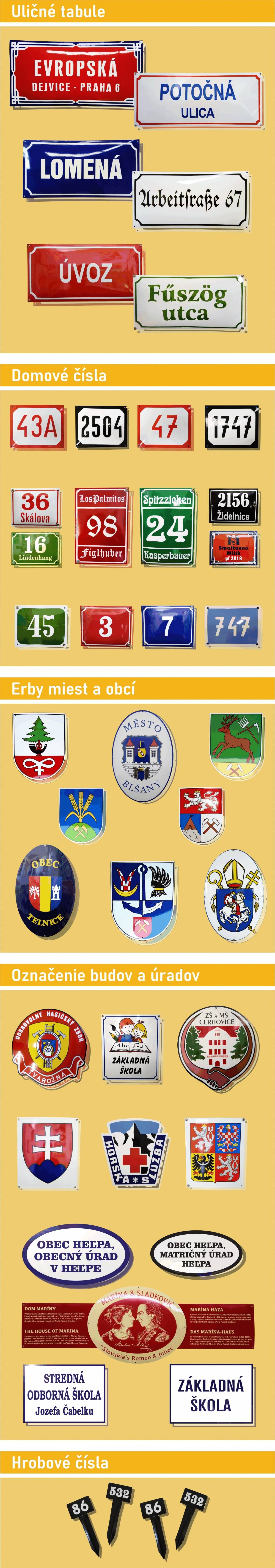 Plastové tabule určené na označovanie ulíc, domov, verejných priestranstiev, obecných a mestských úradov, škôl, štátnych a súkromných budov, firiem, športových areálov, požiarnych zbrojníc, hrobových miest a ďalších.